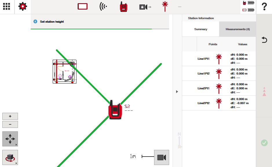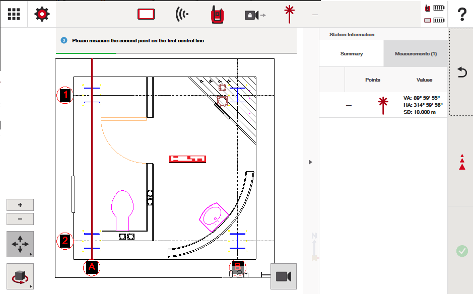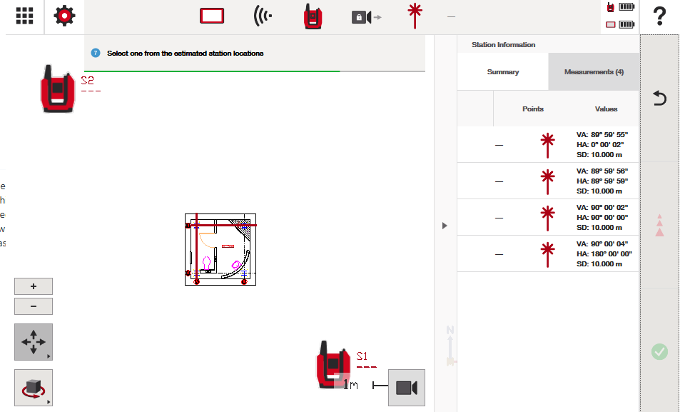 Znovu postupujte podle výzev a změřte druhý bod podél této kontrolní linie, podle stejné rady z kroku 2, tedy měřit co nejdále po linii, o které jste přesvědčeni, že bude přesná. Po dokončení tohoto kroku byste měli vidět 4 body v záložce měření na pravé straně. Bude zobrazen úhel, pod kterým se totální stanice otočila (HA & VA), stejně jako vzdálenost od přístroje, ve které byly body změřeny (SD).