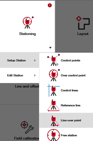 Otevřete proces staničení Line over Point z menu staničení na úvodní obrazovce: