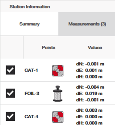 Totální stanice toto pozoruje a poté najde "nejlepší přizpůsobení" těchto kontrolních bodů, aby spolu fungovaly. Ukazuje, jak to udělala, zobrazením obrazovky informací o stanici pro vaše změřené body: