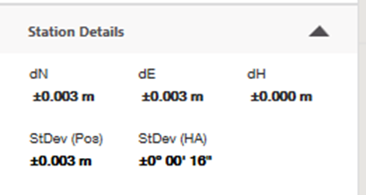 Pokud máte potíže s pochopením podrobností stanice, zkuste proto použít nastavení tolerance a vizuály ze zeleného kruhu rozvržení, abyste zjistili, zda je vaše přesnost stanování vhodná pro vaši práci. Níže je však obrazovka Podrobnosti stanice vysvětlena podrobněji.
