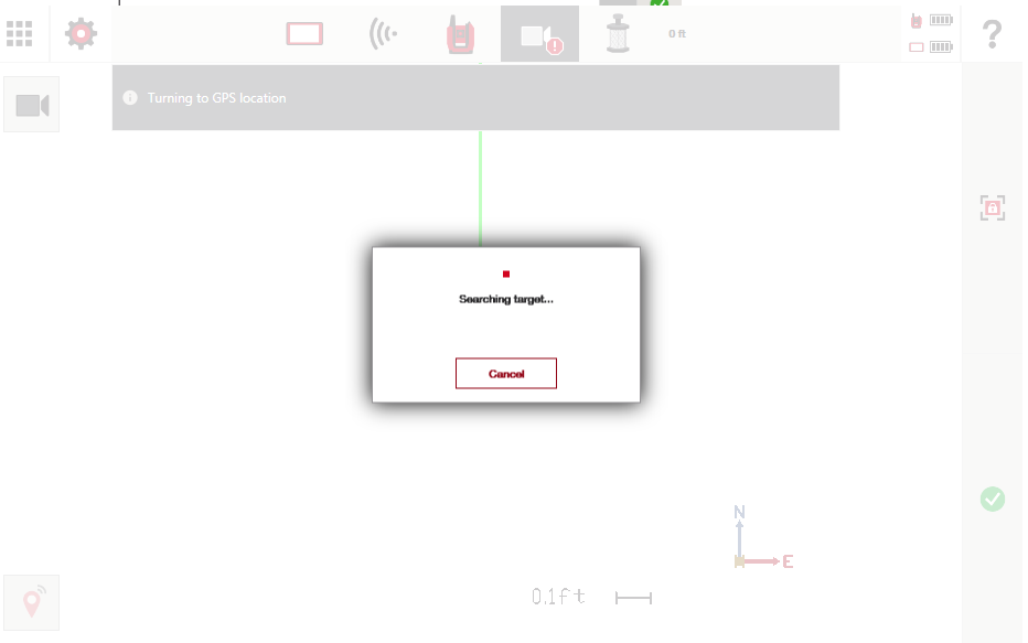 - Nástroj se natočí směrem k odhadované GPS poloze tabletu. Pokud prisma není blízko tabletu, spojení s prizmatem nemusí být dokončeno.