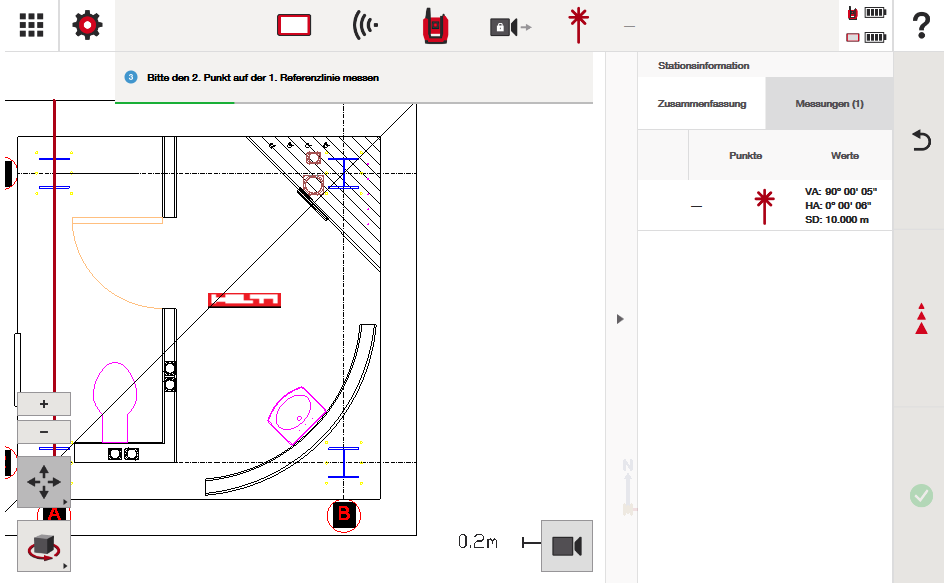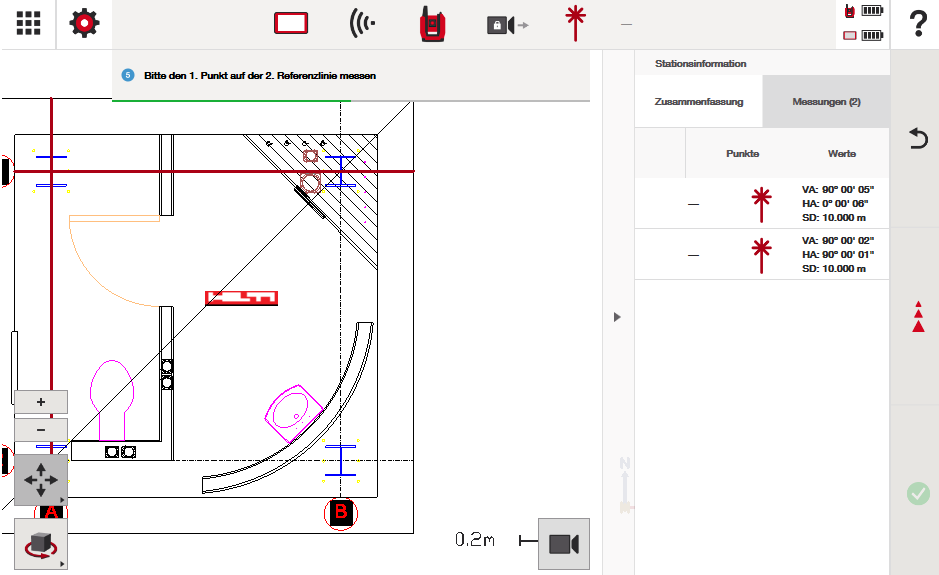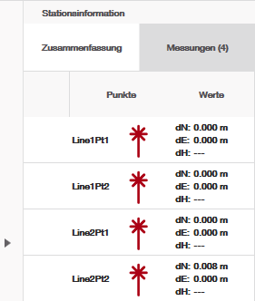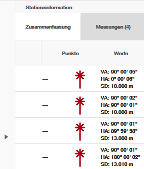 Folgen Sie erneut den Anweisungen und messen Sie den zweiten Punkt entlang dieser Referenz-Linie. Befolgen Sie dabei die gleichen Hinweise wie in Schritt 2, d. h. messen Sie so weit wie möglich entlang der Linie, wobei Sie darauf achten, dass die Messung genau ist. Wenn Sie diesen Schritt abgeschlossen haben, sollten Sie in der Registerkarte „Messungen“ auf der rechten Seite 4 Punkte sehen. Die angegebenen Werte sind die Messwerte (Horizontal- Vertikalwinkel und Entfernung) der Totalstation zu den Punkten.