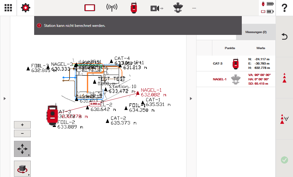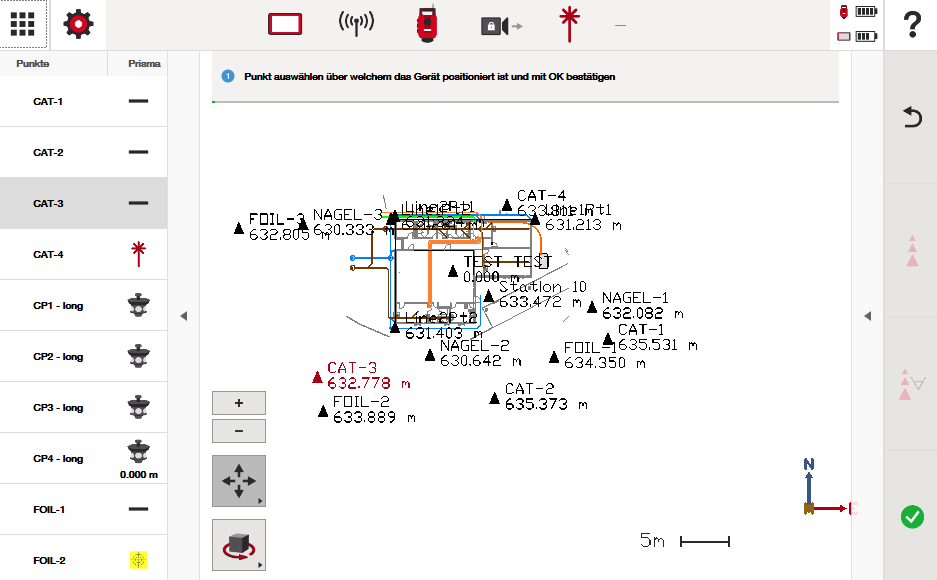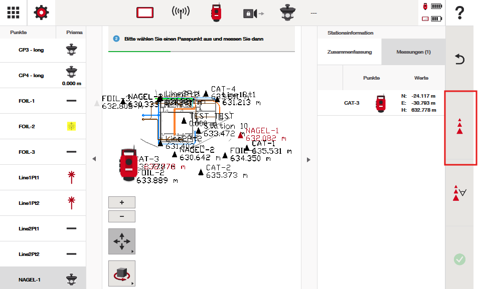 Im folgenden Beispiel befindet sich die Totalstation auf Punkt CAT-3. Drücken Sie auf das grüne Häkchen, um zu bestätigen, dass Sie die richtigen Koordinaten ausgewählt haben.