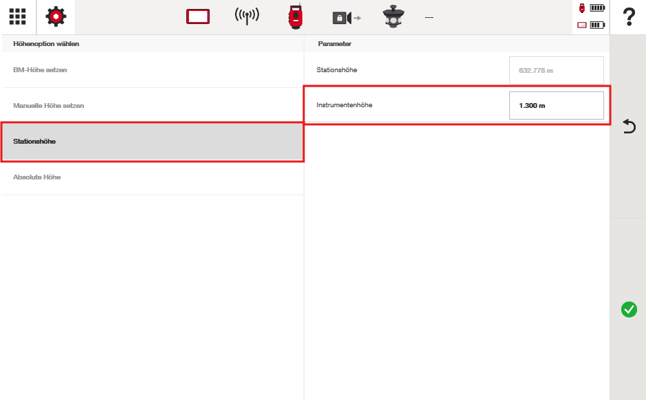 Anschließend werden Sie automatisch zum Bildschirm „Stationshöhe” weitergeleitet, wo Sie nur die Option „Instrumentenhöhe” einstellen können. Dies liegt daran, dass die Totalstation die Höhe des Punktes annimmt, den wir während der Stationierung verwendet haben (632,778 m).