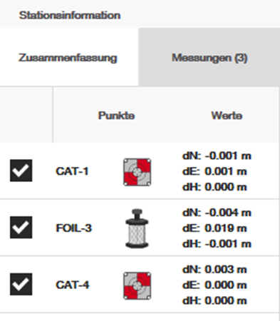 Im folgenden Beispiel sehen Sie, dass ich drei Referenz-Punkte auf meiner Baustelle gemessen habe: CAT-4, FOIL-3 und CAT-1