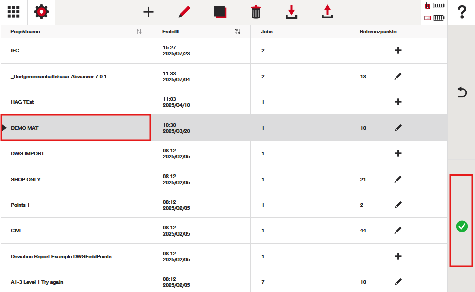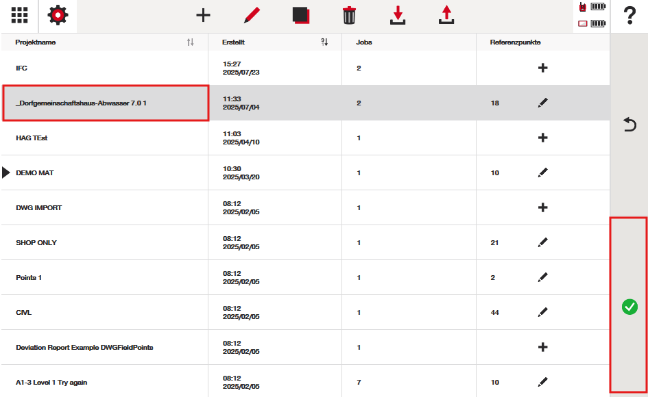 Suchen Sie das Projekt in Ihrer Liste und drücken Sie auf das grüne Häkchen, um das Menü „Jobs” aufzurufen: