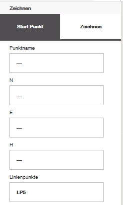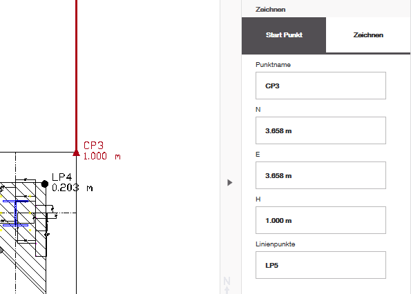 Nachdem Sie einen Punkt ausgewählt haben, überprüfen Sie, ob der Name und die Koordinaten des Startpunkts korrekt sind und ob die „Linienpunkte“, die Sie erstellen möchten, so beschriftet sind, wie Sie es beim Skizzieren beabsichtigen. Im folgenden Beispiel lautet der Name meines Linienpunkts „LP5“, und wenn ich nacheinander weitere Linien zeichne, erhöht sich auch die Punktnummer, während das Präfix gleich bleibt.