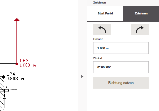 „Abstand“ ist der Abstand, den die nächste Linie von dem Punkt, an dem Sie begonnen haben, zurücklegen soll, und „Winkel“ ist der Winkel, in dem sie sich von diesem Punkt aus drehen soll. Beachten Sie, dass 0° direkt nach oben zeigt (Nordrichtung).