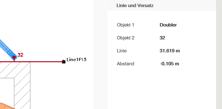 Die von Ihnen ausgewählte Linie oder der Bogen sollte als „Objekt 1” aufgeführt sein, während der Punkt als „Objekt 2” aufgeführt sein sollte. Die „Linien”-Messung ist der Abstand vom Anfang der Linie bis zu Ihrem ausgewählten Punkt. Der „Versatz” ist der Abstand vom nächstgelegenen Punkt der Achse 2/3-Punkt bis zum gemessenen Punkt.