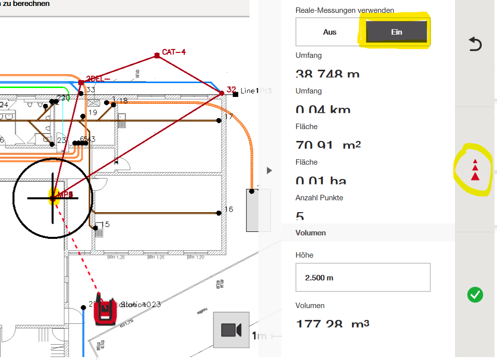 Live-Messungen bedeuten, dass Sie Objekte auf Ihrer Baustelle messen können, um die Fläche zu erstellen, die Sie berechnen möchten. Dies ist praktisch, wenn Sie Flächen messen möchten, während Sie sich mit dem Prisma bewegen, oder wenn Sie die Position eines Punktes in Echtzeit ändern müssen. Wenn Live-Messungen aktiviert sind, können Sie die vorhandenen Punkte in der CAD-Datei sowie die von Ihnen live durchgeführten Messungen kombinieren, um Ihre Fläche und Ihr Volumen zu berechnen. Um Live-Messungen durchzuführen, drücken Sie einfach auf die Schaltfläche „Messen” auf der rechten Seite des Bildschirms.