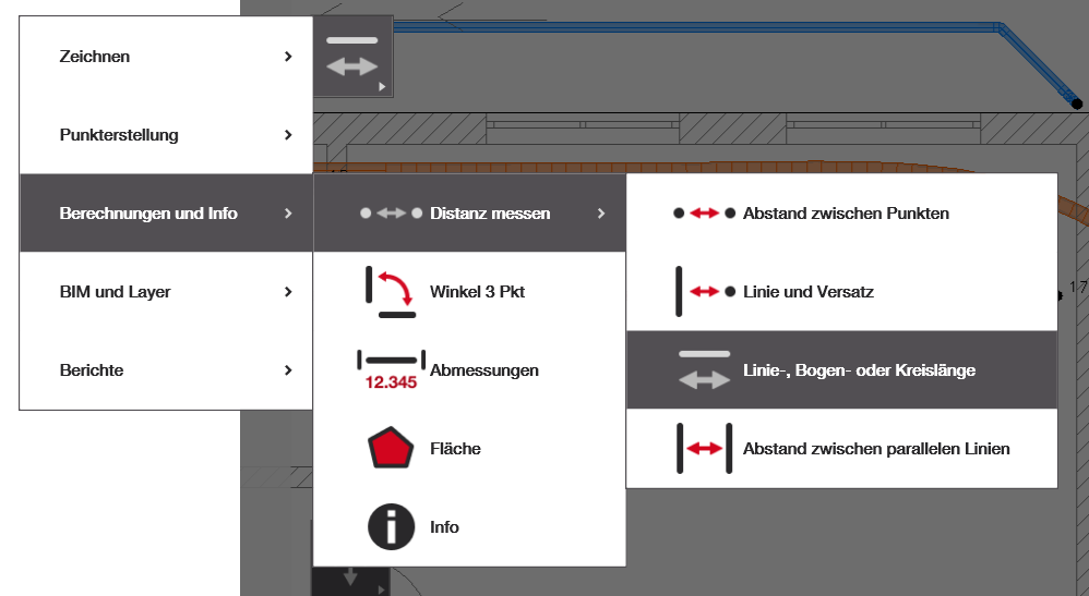 Die Anwendung für Linien-, Bogen- oder Kreislänge liefert Ihnen Informationen zu jedem dieser Objekte, darunter Länge, Neigung, Entfernung, Höhe und Richtung.