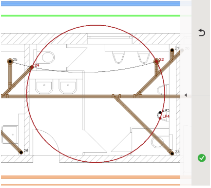 Wählen Sie in Ihrer Datei die drei Punkte aus, durch die Ihr Kreis verlaufen soll. Nach der Auswahl sollten diese Punkte rot werden. Nachdem drei Punkte ausgewählt wurden, sollte eine rote Linie erscheinen, die sie verbindet. Um die Auswahl der Punkte aufzuheben oder den Auswahlvorgang neu zu starten, klicken Sie einfach erneut auf einen anderen Punkt. Klicken Sie anschließend auf das grüne Häkchen auf der rechten Seite, um den Kreis zu Ihrer Zeichnung hinzuzufügen.