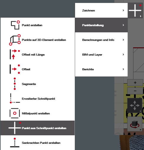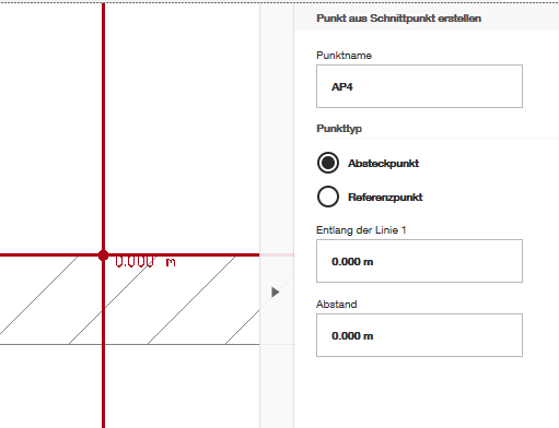 Wählen Sie zwei sich schneidende Linien aus. Nach der Auswahl sollten sie rot werden und an der Schnittstelle sollte ein roter Punkt erscheinen. Jetzt können Sie den Namen und den Typ des Punktes ändern. Sehen Sie sich einfach das Menü auf der rechten Seite an, bearbeiten Sie das Textfeld unter dem Punktnamen und wählen Sie den gewünschten Punktetyp (Absteck- oder Referenzpunkt).