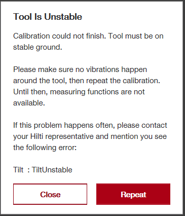 The Tool Is Unstable message can be raised during both tilt and field calibration. While the internal detection logic differs, both cases indicate that the instrument could not complete calibration due to physical instability or motion during the calibration process. Because the corrective action is the same (stabilizing the setup and repeating calibration), the resolution message is identical.
