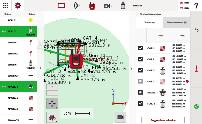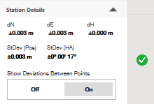 La información del valor de desviación le muestra cuánto tuvo que ajustar el software el punto desde su ubicación medida para que encajara con el diseño que buscaba el archivo digital. Note que para el punto "CAT-4," fue imposible usarlo en el cálculo de estacionamiento. Este punto, en relación con los otros puntos medidos, fue imposible de ajustar de manera realista a como el diseño lo requería. Este punto estaba demasiado alejado de su medición diseñada (al menos 200 mm) para siquiera ser considerado.