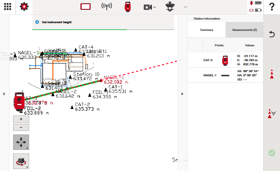 Use la lista de puntos en el lado izquierdo, o seleccione el punto desde la vista CAD y presione la marca de verificación verde para indicar la ubicación de su estación total. En el ejemplo a continuación, la estación total está ubicada en el punto CAT-3. Presione la marca de verificación verde para confirmar que ha seleccionado la coordenada correcta.
