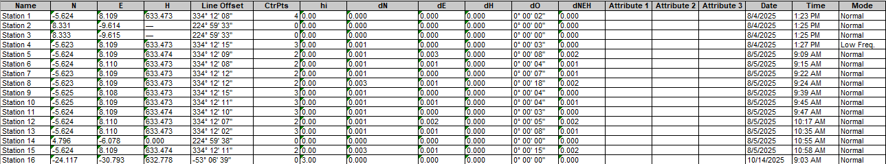 Como indica la captura de pantalla, cada estacionamiento individual que se complete tendrá el nombre de la estación, las coordenadas de la estación y el modo de frecuencia que se estableció durante la calibración.