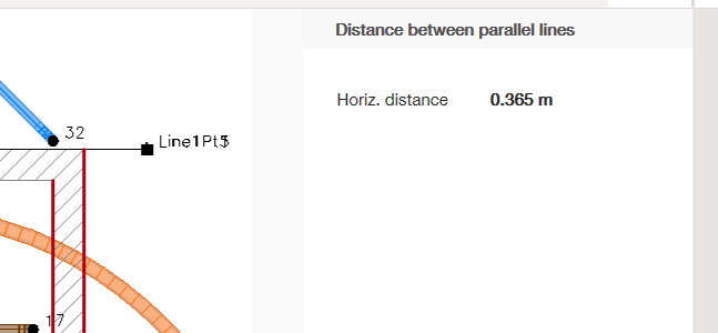 Una vez que presiones la marca de verificación verde, podrás ver tu resultado y la Distancia Horiz. (Distancia Horizontal) aparecerá, mostrándote la distancia horizontal entre las líneas paralelas. En el ejemplo a continuación, esto es 0.3 m.