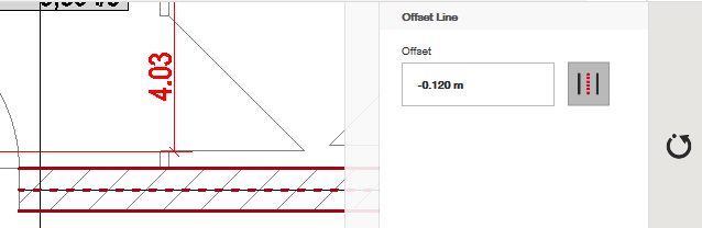 Selecciona el objeto del cual quieres crear un duplicado desplazado. Debería aparecer un duplicado rojo en algún lugar a la derecha de este. En la parte superior derecha puedes encontrar y cambiar la distancia de desplazamiento. En el ejemplo a continuación es 0.3 m. Esto significa que la nueva línea creada estará 0.3 metros a la derecha de la línea original. Para crear una línea desplazada hacia la izquierda, solo tienes que hacer clic en la línea original una segunda vez y la línea roja se moverá a la distancia de desplazamiento elegida a la izquierda de la original. Si haces clic una tercera vez en la línea, la línea desplazada desaparecerá.