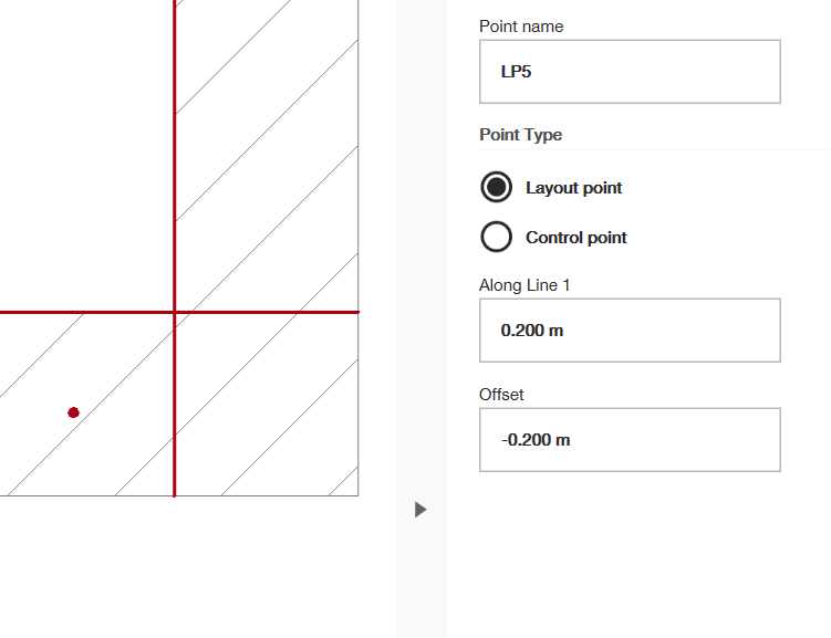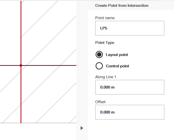 También puedes editar la ubicación del punto definiendo la distancia de desplazamiento desde cada línea. Bajo "A lo largo de la Línea 1", puedes editar la distancia que quieres que tu punto tenga desde la primera línea que seleccionaste (en metros). Luego, bajo "Desplazamiento" puedes definir la distancia en relación con la segunda línea que seleccionaste. Una vez que hayas terminado, selecciona la marca de verificación verde a la derecha de tu pantalla y el punto será añadido a tu dibujo.