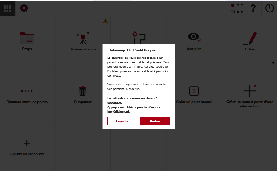 Cuando se activan las calibraciones en campo, los usuarios pueden decidir posponer la calibración 30 minutos o continuar. Nota: en caso de posposición, la herramienta se calibrará automáticamente después de 30 minutos sin posibilidad de una nueva posposición.