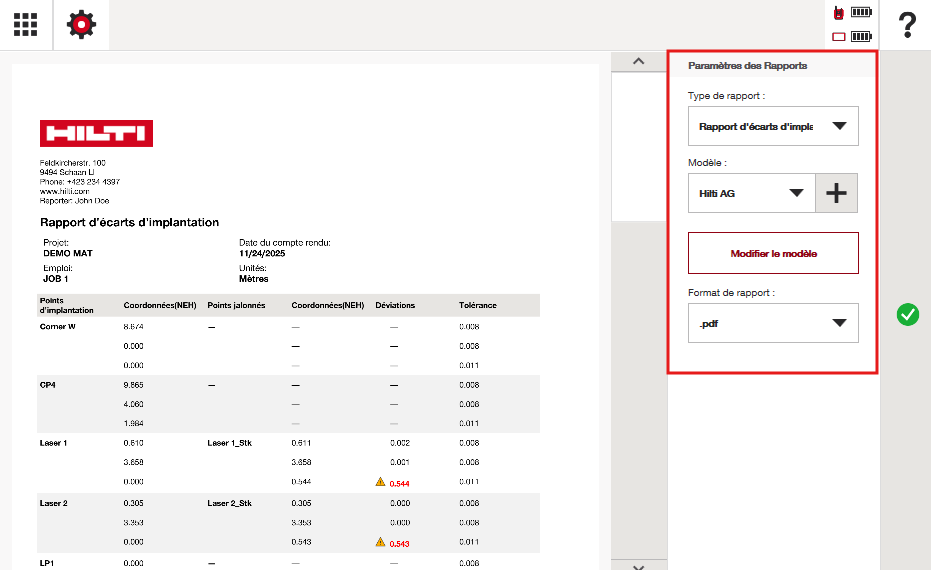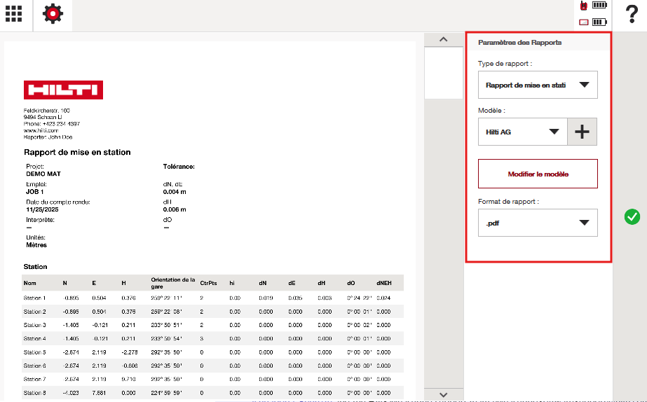 Ahora es posible aplicar previamente ciertos formatos a su informe de puesta en estación, así como obtener una versión PDF o XLXS de su informe. Consulte este artículo para obtener la información actualizada.