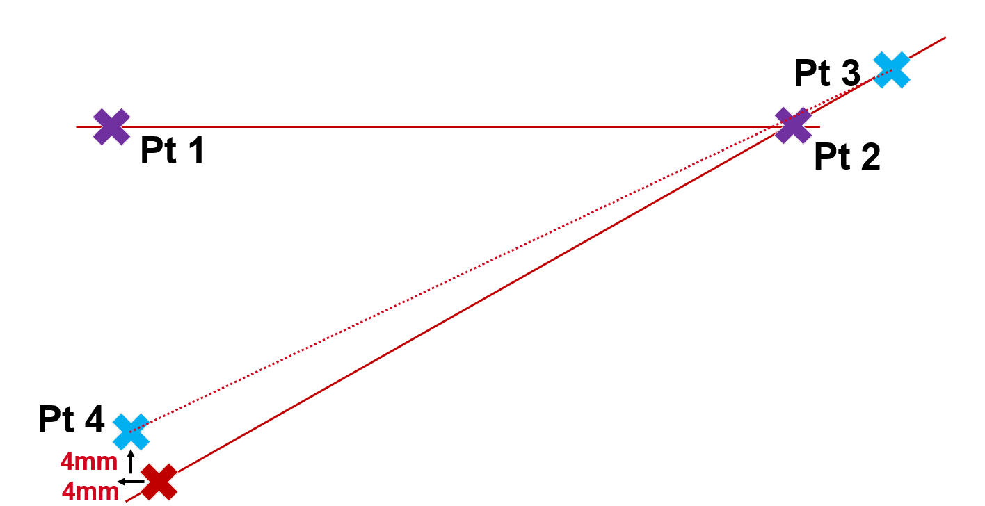 Violetit pisteet (piste 1 ja 2 viivalta 1) katsotaan tarkiksi ja vertailupisteiksi. Piste 3 (sininen) määrittää, missä toinen viiva sijaitsee avaruudessa, ja se on mitattu tarkasti. Piste 4 on toinen viivan viimeinen mitattu piste, jolla on 4 mm:n pohjoinen poikkeama (suunniteltua viivaa korkeammalla) ja 4 mm:n länsipoikkeama (suunniteltua viivaa vasemmalla).