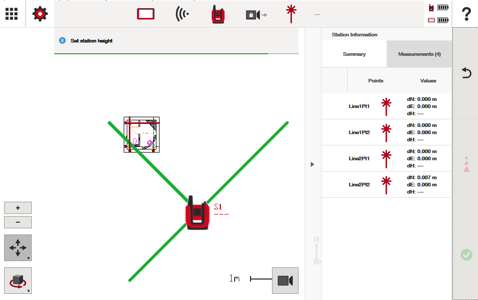 - Kun mittaat viimeisen pisteen (toisen viivan toinen piste), kokonaisasema kertoo, että "olettaen, että ensimmäiset kolme pistettä mitattiin täydellisesti, tällä viivalla on juuri mittaamassasi pisteessä tietty poikkeama suunnitelmasta."