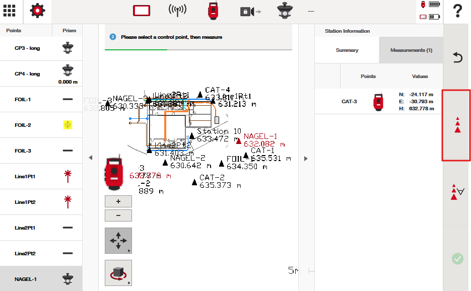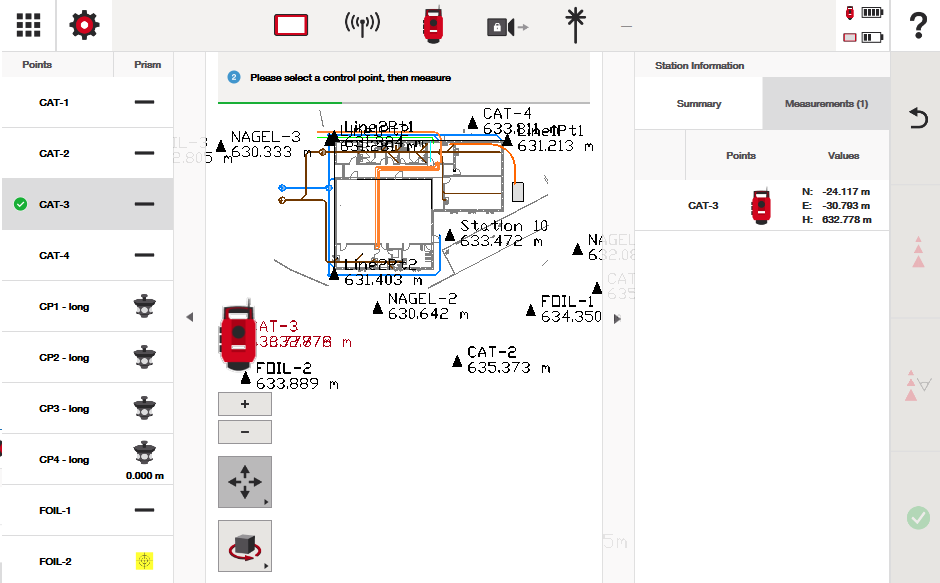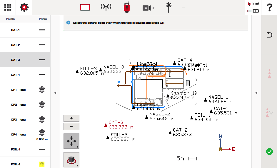 Käytä vasemmalla olevaa pistevalikkoa tai valitse piste CAD-näkymästä ja paina vihreää valintamerkkiä vahvistaaksesi total stationin sijainnin. Alla olevassa esimerkissä total station sijaitsee pisteessä CAT-3. Paina vihreää valintamerkkiä vahvistaaksesi, että olet valinnut oikean koordinaatin.
