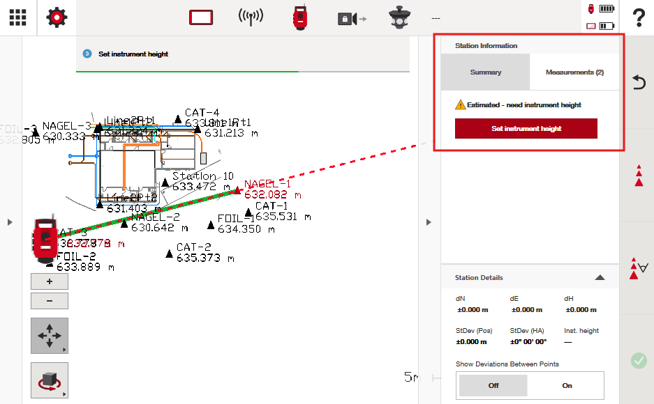 Instrumentin korkeus on yksinkertaisesti etäisyys maasta, jossa piste sijaitsee, teleskoopin keskukseen, joka näkyy pääyksikössä ristillä. On tärkeää ilmoittaa tämä etäisyys, jotta total station tietää, kuinka korkealla teleskooppi on koordinaattipisteestä ja pystyy tekemään tarkkoja korkeusmittauksia työn aikana.