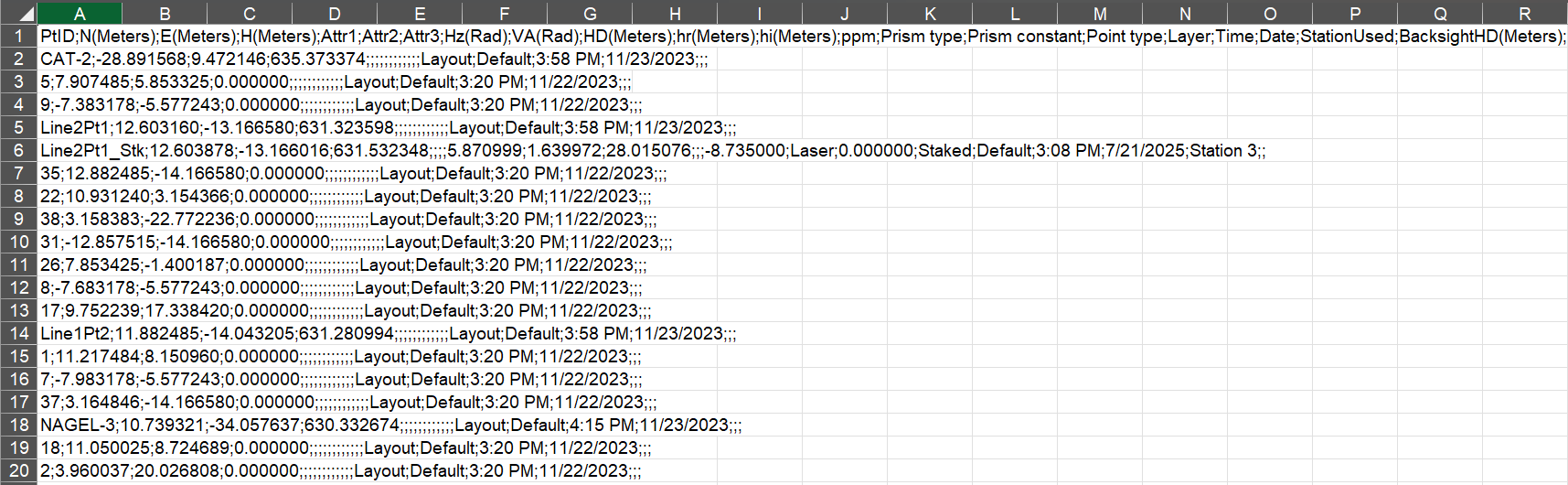 Kun avaat pisteiden CSV-tiedoston, näet, että jokaisesta pisteestä tallennetaan paljon tietoa, jotka voivat olla erittäin hyödyllisiä projektiasi ja mitattuja tai asemointeja pisteitä tarkastellessasi.