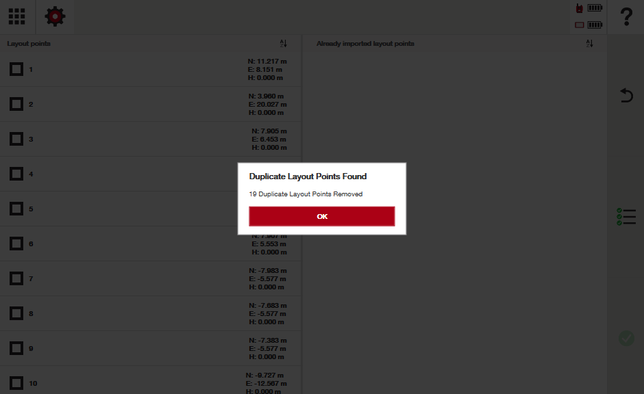 Jos ohjelmisto havaitsee csv-tiedostossa pisteitä, joilla on samat nimet ja koordinaatit, se poistaa kaksoiskappaleet ja ilmoittaa siitä. Huomaa, että on erittäin suositeltavaa tarkistaa pisteluettelosi ennen tuontia poistaaksesi tai muuttaaksesi samannimisiä pisteitä. Tämä auttaa tekemään tuontiprosessista sujuvamman ja vähentää virheiden mahdollisuutta: