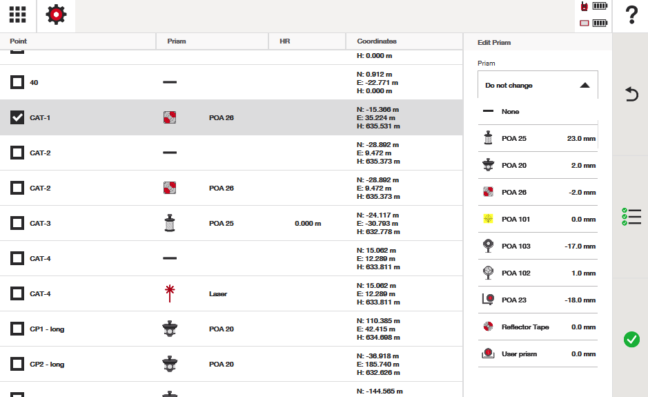 Kun muokkaus on valmis, paina vihreää valintamerkkiä poistuaksesi prismien muokkausvalikosta. Pistetietojen tuontiprosessi on sitten samanlainen kuin asemointipisteillä, mutta näytöllä näkyvät myös pisteisiin liittyvät prismat ja mittatikun korkeus: