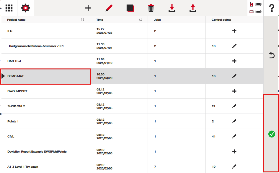 Klikkaa ruudun yläreunassa olevaa "plus"-kuvaketta luodaksesi uuden projektin, tai avaa projekti painamalla vihreää valintamerkkiä siirtyäksesi "tehtävät"-näyttöön, jossa piirustus voidaan tuoda: