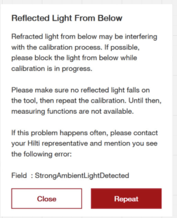 “Heijastunut valo alapuolelta” -viesti on suojaustoimenpide. Se estää optisen häiriön hiljaisen vaikutuksen kalibrointituloksiin.