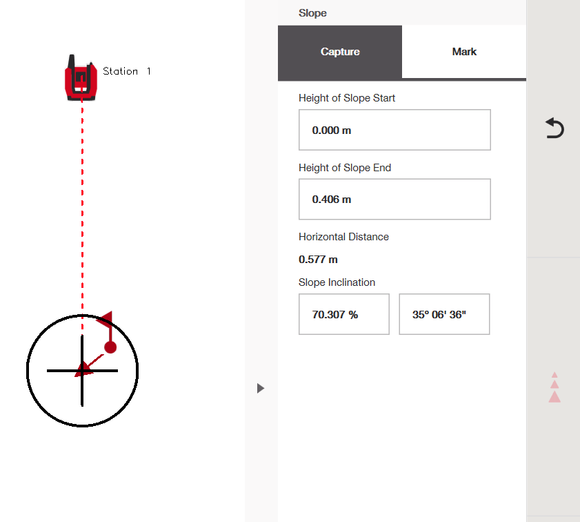 Merkitse-toimintoa käytetään kaltevuuden mittauksen jälkeen. Sen avulla voidaan seurata pisteitä suhteessa mitattuun kaltevuuteen suoraan työmaalla.