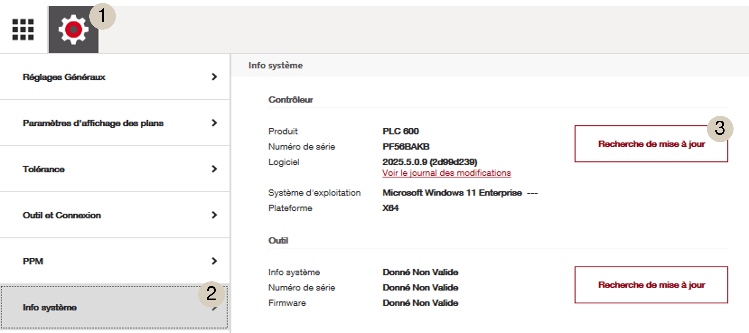Deux mises à jour doivent être vérifiées régulièrement : les mises à jour logicielles et les mises à jour du micrologiciel. Heureusement, ces deux opérations sont faciles à effectuer à partir de la même fenêtre du logiciel. Il suffit d'aller dans les paramètres (1), d'appuyer sur « Informations système » (2), puis sur « Vérifier les mises à jour » (3) pour la mise à jour que vous souhaitez effectuer.