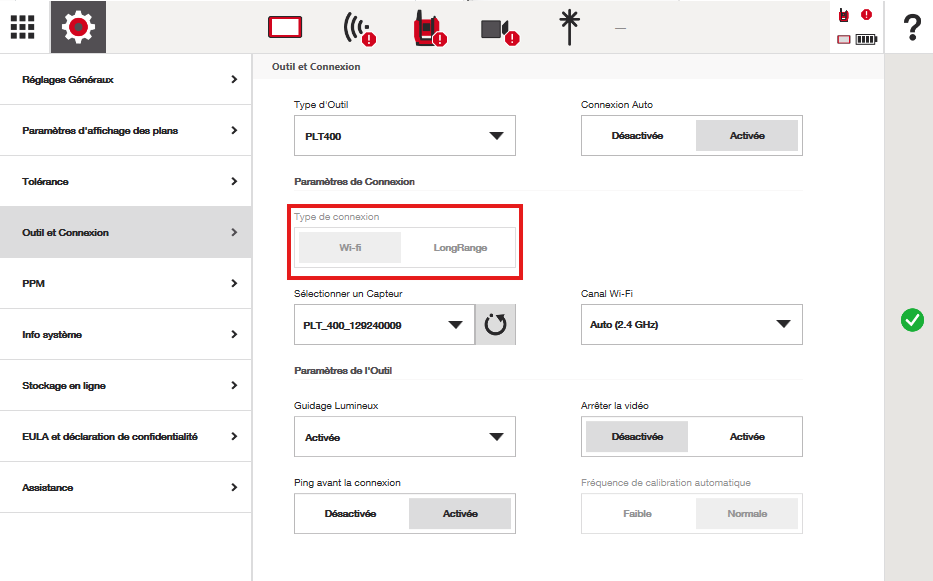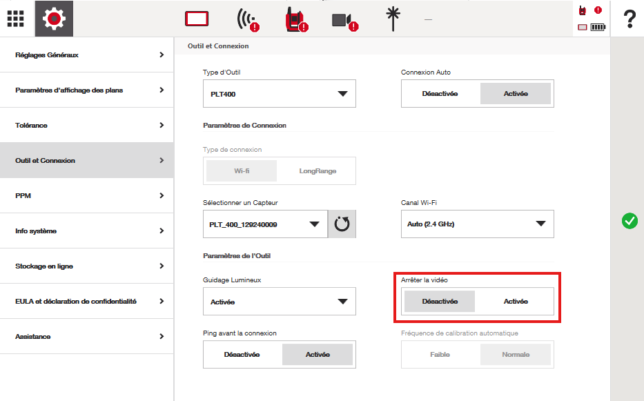 Pour le PLT 400, vous avez la possibilité d'« arrêter la vidéo » dans la fenêtre des paramètres « Outil et connexion ».