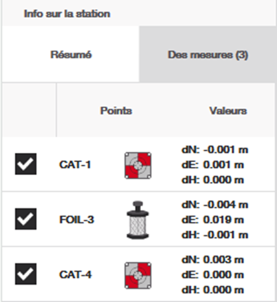 Dans l'exemple ci-dessous, vous pouvez voir que j'ai mesuré 3 points de contrôle sur mon chantier : CAT-4, FOIL-3 et CAT-1.