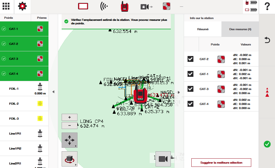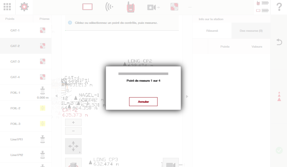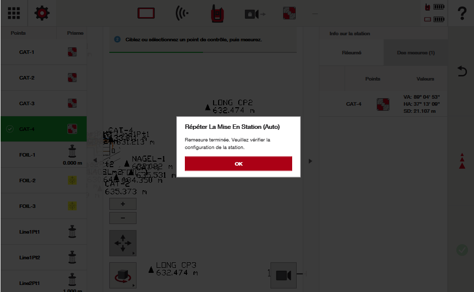 La station totale tente de remesurer automatiquement tous les points connus utilisés dans le processus de mise en station d'origine. Laissez l'outil terminer ce processus. Vous pourrez ensuite effectuer vos propres mesures manuelles si nécessaire.