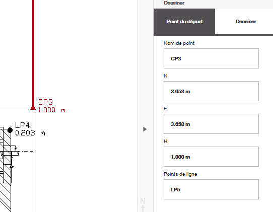 Une fois que vous avez sélectionné un point, vérifiez que le nom et les coordonnées du point de départ sont corrects et que les « points de ligne » que vous souhaitez créer sont étiquetés comme vous le souhaitez pendant que vous esquissez. Dans l'exemple ci-dessous, le nom de mon point de ligne est « LP5 » et, à mesure que je trace plusieurs lignes successives, le numéro du point augmente, tandis que le préfixe reste le même.