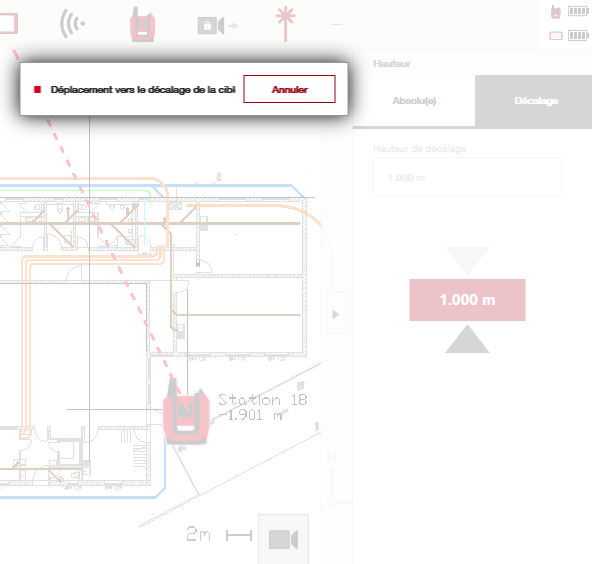 L'outil peut également être déplacé en mode manuel à l'aide de la caméra ou en suivant un prisme, et il suivra en temps réel la distance qui le sépare de l'emplacement de hauteur de décalage que vous avez désigné :