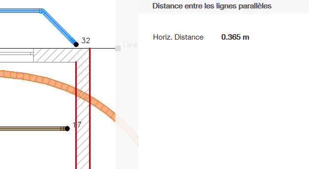 Une fois que vous avez appuyé sur la coche verte, vous pouvez voir votre résultat et la distance horizontale (Horiz. Distance) apparaîtra, vous donnant la distance horizontale entre les lignes parallèles. Dans l'exemple ci-dessous, elle est de 0,3 m.