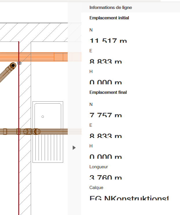 Dans cet exemple, le résultat à droite affiche les coordonnées CAO du point de départ et du point d'arrivée de la ligne par rapport à votre fichier CAO. La longueur de la ligne et le calque CAO de l'élément sont également indiqués.