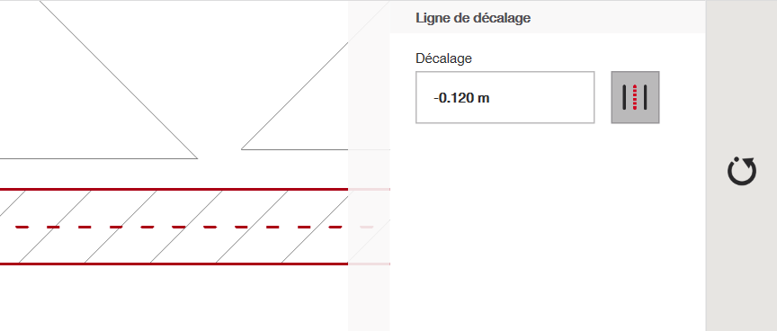 Sélectionnez l'objet à partir duquel vous souhaitez créer un duplicata décalé. Un duplicata rouge devrait apparaître quelque part à droite de celui-ci. En haut à droite, vous pouvez trouver et modifier la distance de décalage. Dans l'exemple ci-dessous, celle-ci est de 0,3 m. Cela signifie que la nouvelle ligne créée se trouvera à 0,3 mètre à droite de la ligne d'origine. Pour créer une ligne décalée vers la gauche, il suffit de cliquer une deuxième fois sur la ligne d'origine et la ligne rouge se déplacera vers la gauche de l'original, à la distance de décalage que vous avez choisie. Si vous cliquez une troisième fois sur la ligne, la ligne décalée disparaîtra.