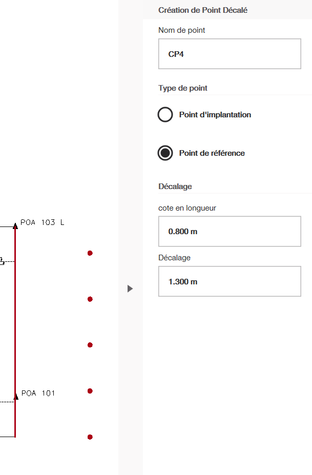 L'application Point de décalage vous permet de créer des points à partir de n'importe quelle ligne ou arc. Une fois l'application ouverte, il suffit de toucher la ligne ou l'arc à partir duquel vous souhaitez créer des points de décalage et d'indiquer la distance de décalage. Enfin, indiquez la distance entre chaque point de décalage que vous créez.