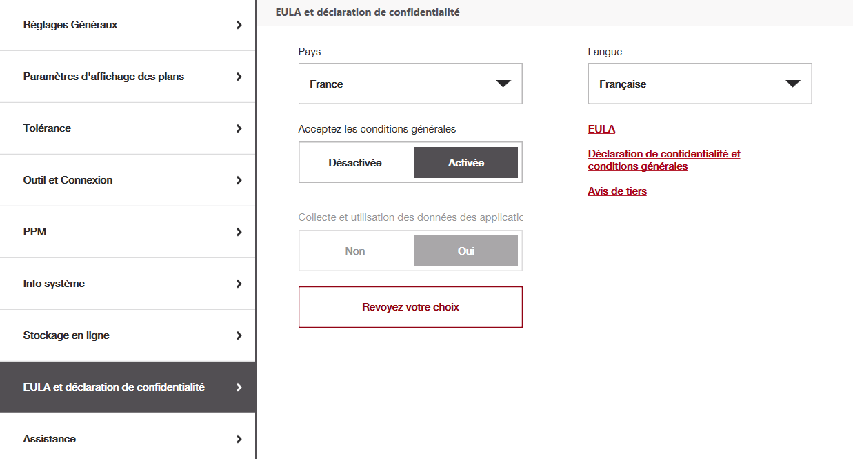 En acceptant le partage des données, le consentement est donné pour l'utilisation des données comme décrit dans l'Avis de confidentialité. Le consentement peut être retiré à tout moment via les mêmes paramètres EULA & Avis de confidentialité.