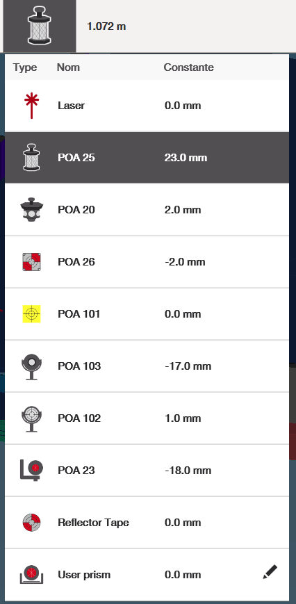 - Sélectionnez le prisme : Sélectionnez le prisme qui sera utilisé pour la mesure. La hauteur du prisme doit également être saisie en sélectionnant la valeur de hauteur à côté de la sélection du prisme et en l'ajustant en conséquence.