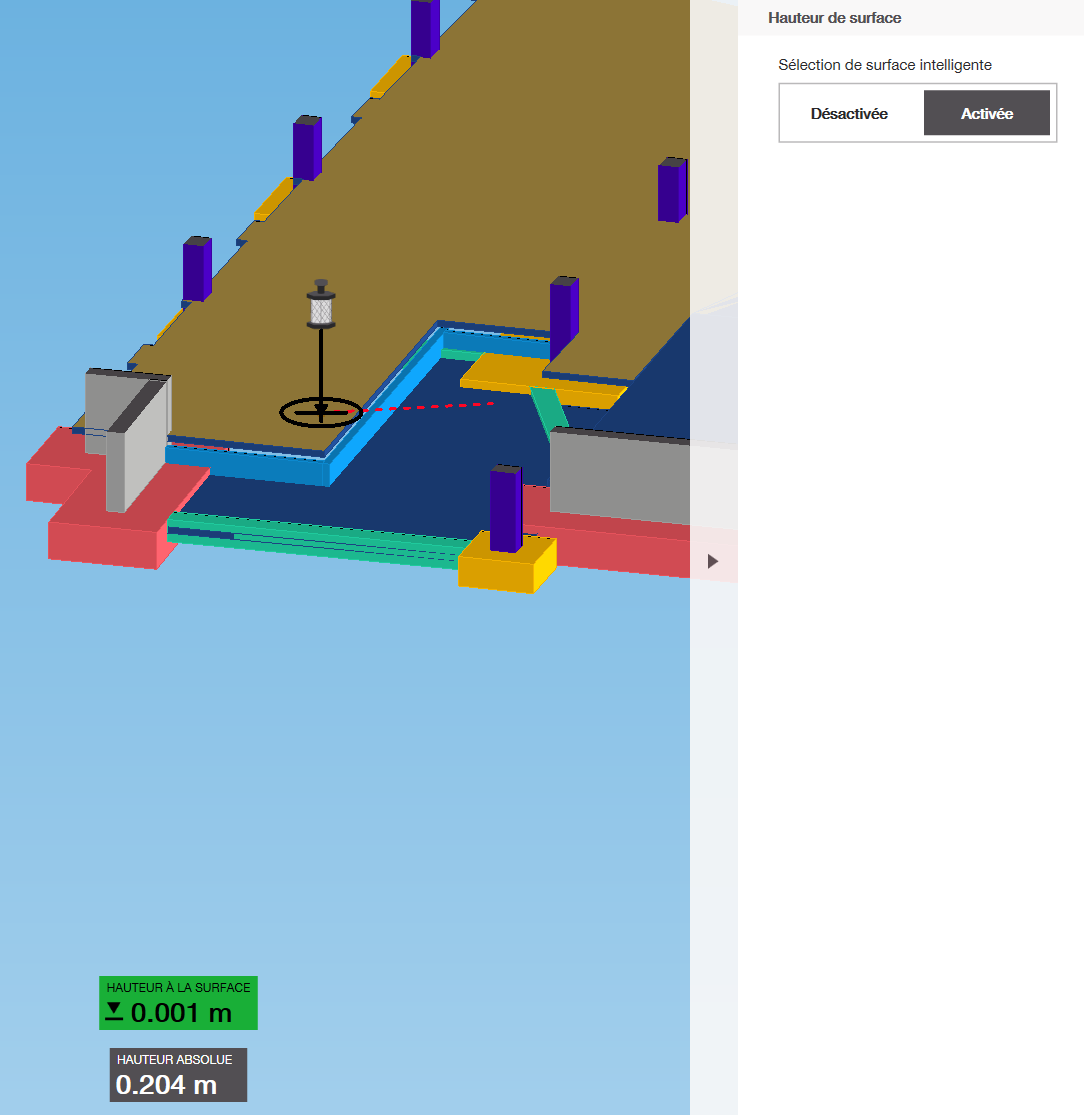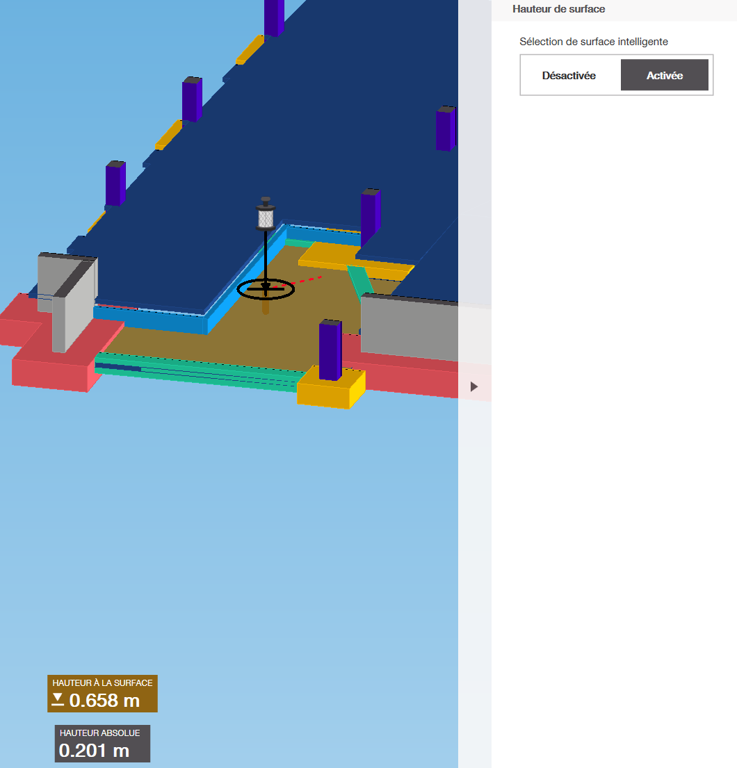 Lorsqu'elle est activée, l'application sélectionne automatiquement la surface située à la verticale du prisme et la met en surbrillance directement dans la vue CAO.
