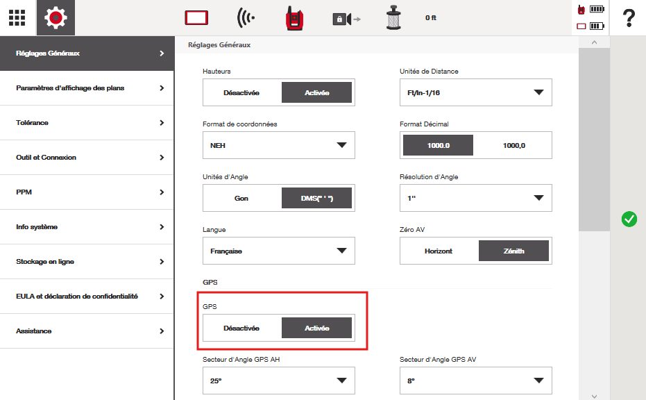 Pour activer le GPS sur votre tablette, allez dans Paramètres>Paramètres généraux>GPS et activez-le. Vous n’avez pas besoin d’ajuster le « Secteur d’angle GPS » à moins d’être sûr de ce que vous faites. Les secteurs d’angle par défaut sont prédéfinis comme la meilleure fenêtre angulaire de recherche pour trouver votre prisme lorsque le GPS est utilisé pour pointer vers votre position.